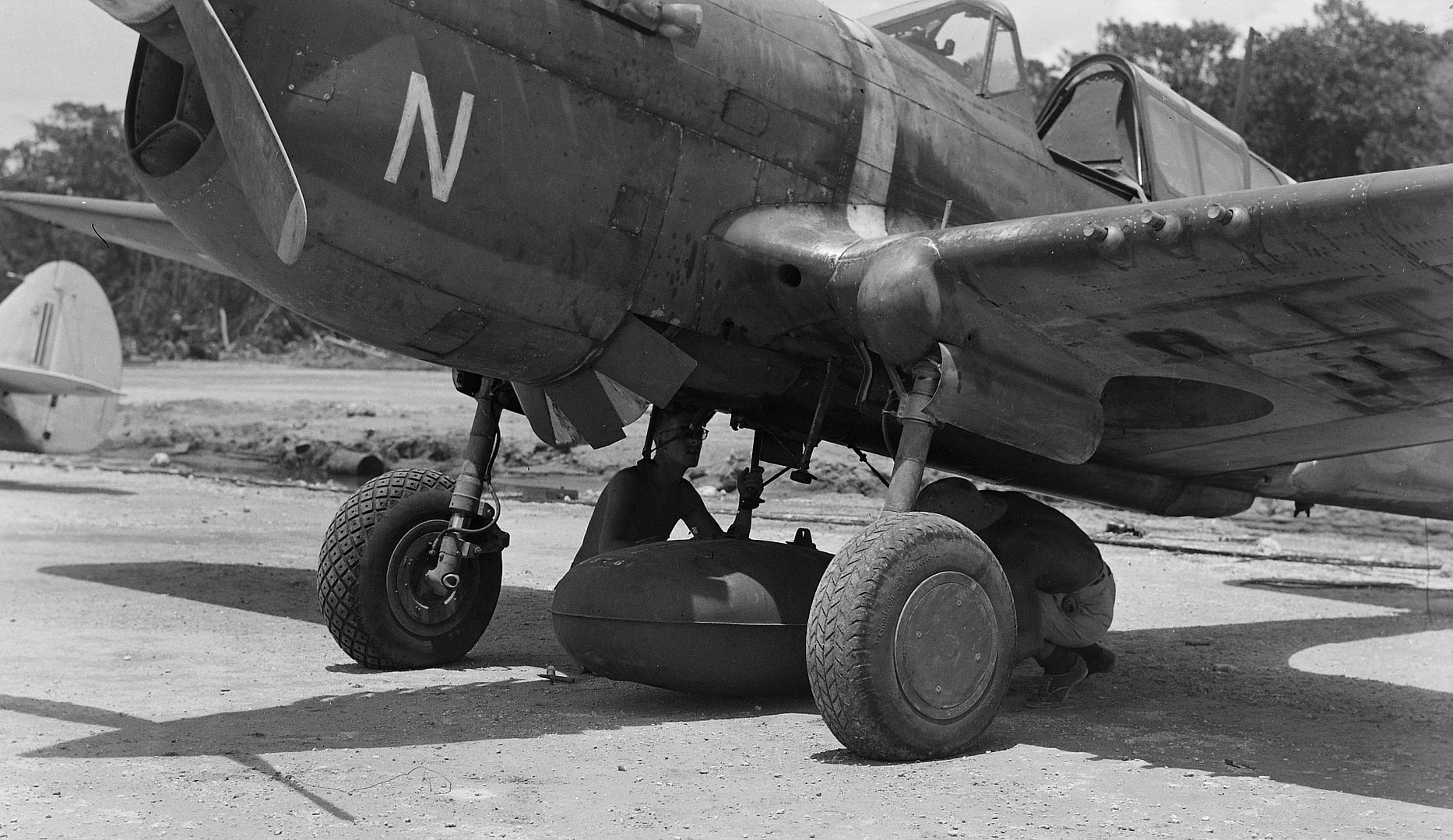 Groundcrew servicing RNZAF Kittyhawk NZ3094. Presumed to be No. 2 Fighter Maintenance Unit, Espiritu Santo.