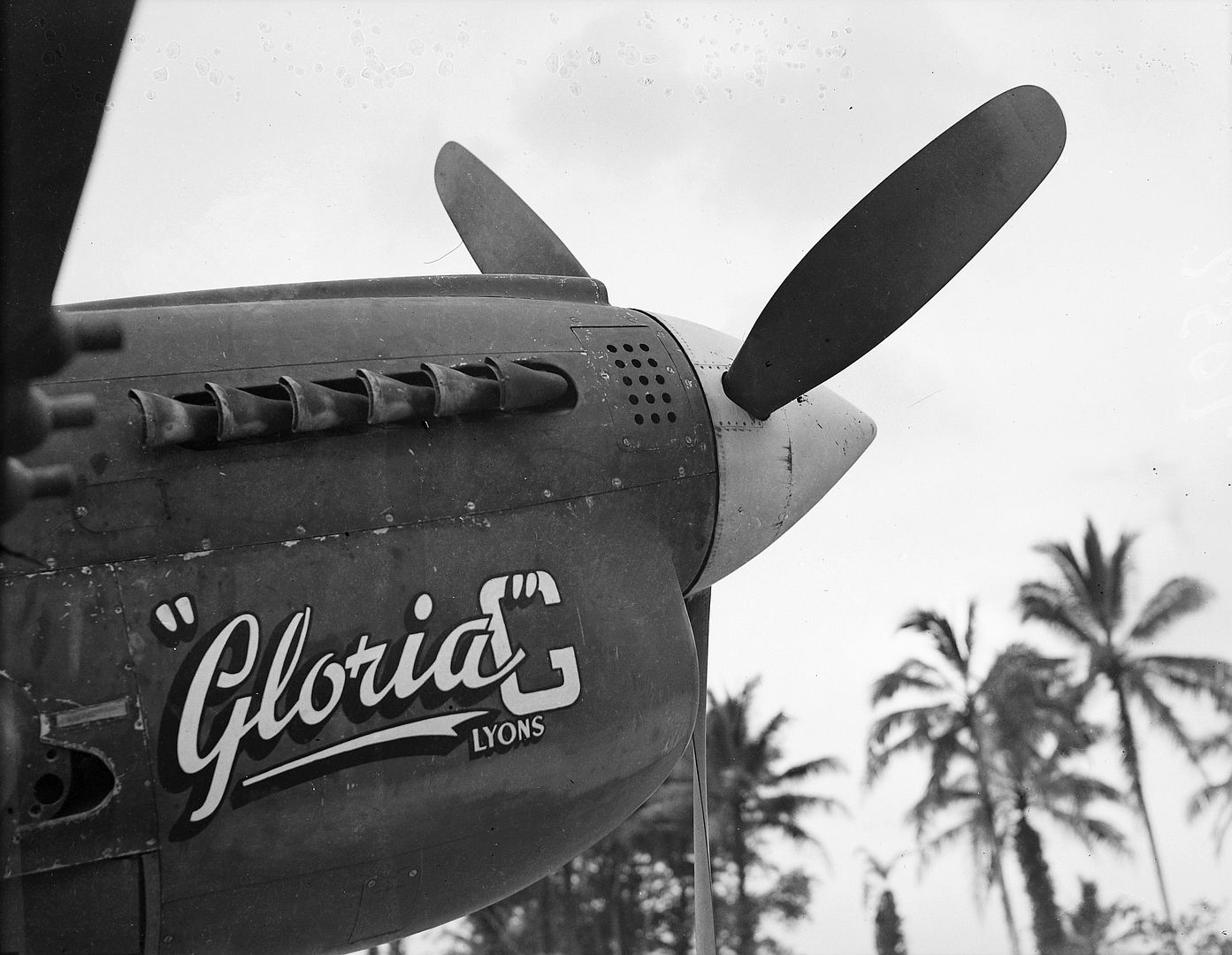 Side view of No. 4 Servicing Unit Kittyhawk NZ3220 with 'Gloria Lyons' nose art. Believed to be Torokina, Bougainville.