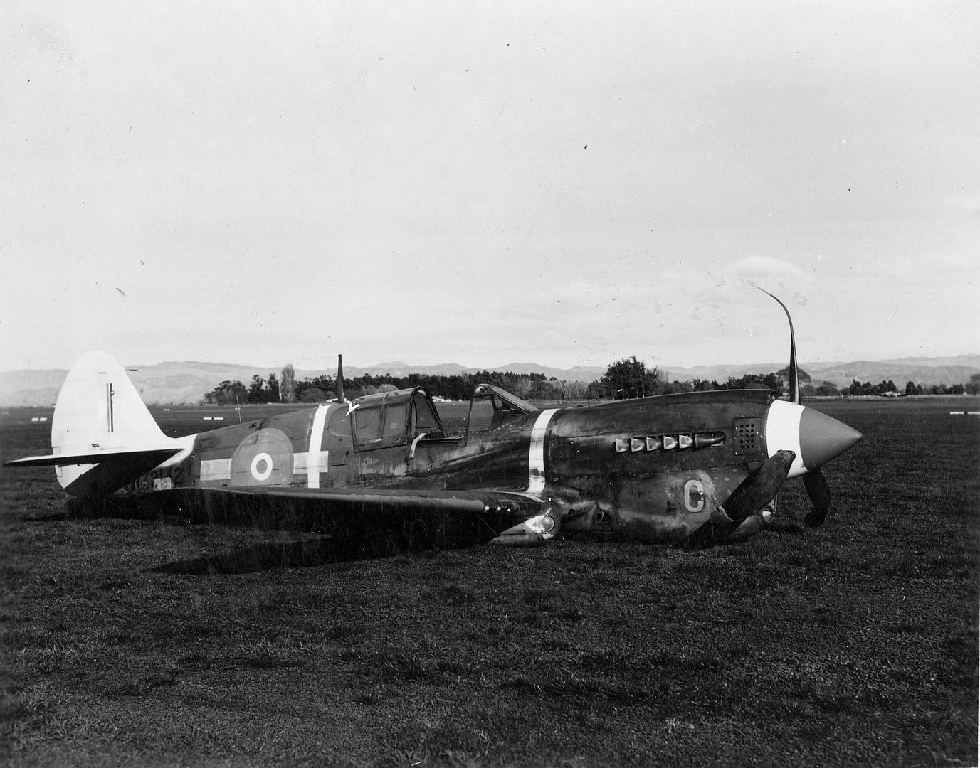 Kittyhawk NZ3142, flown by Squadron Leader RM McKay, from the Fighter Gunnery School, after belly landing at RNZAF Station Gisborne.
