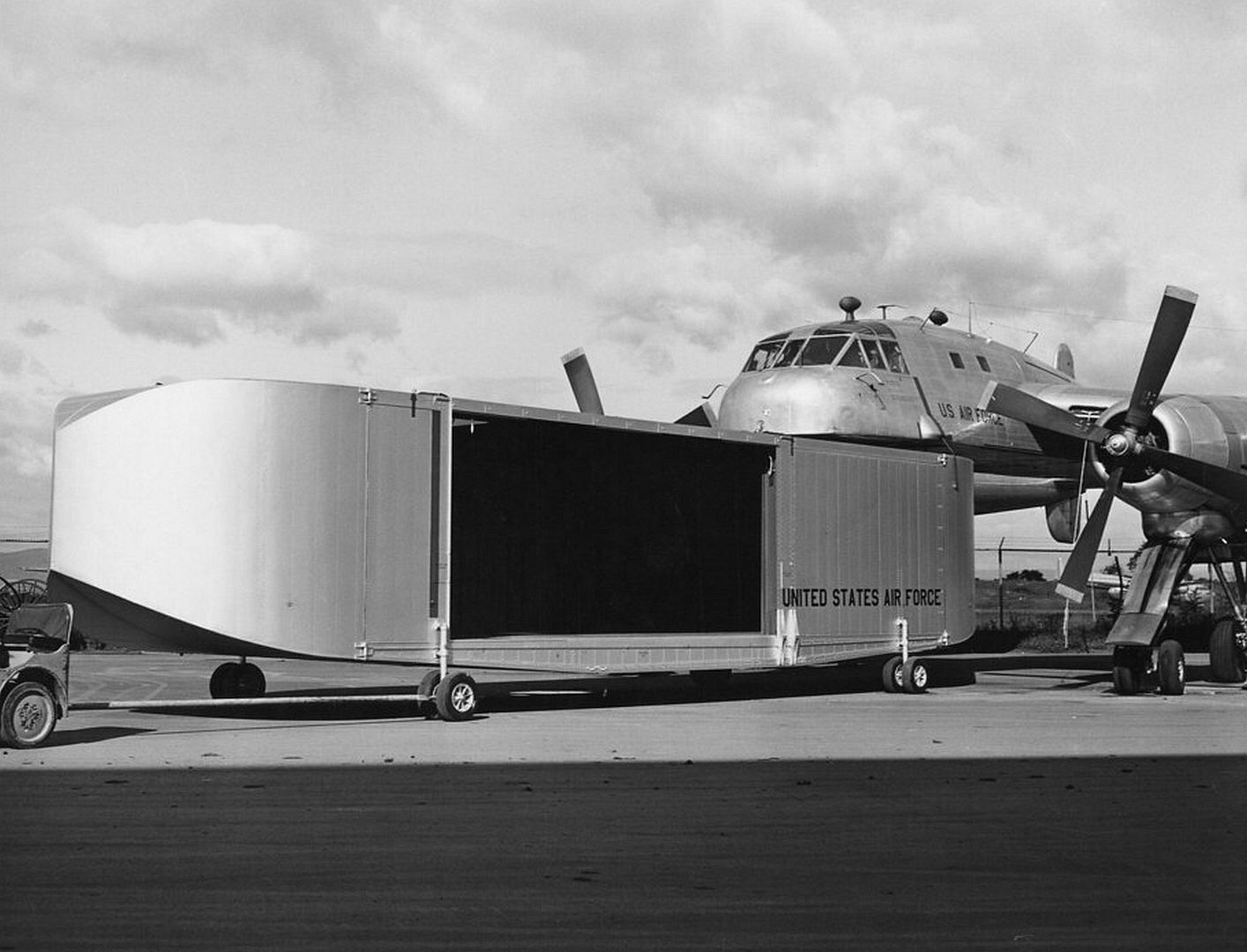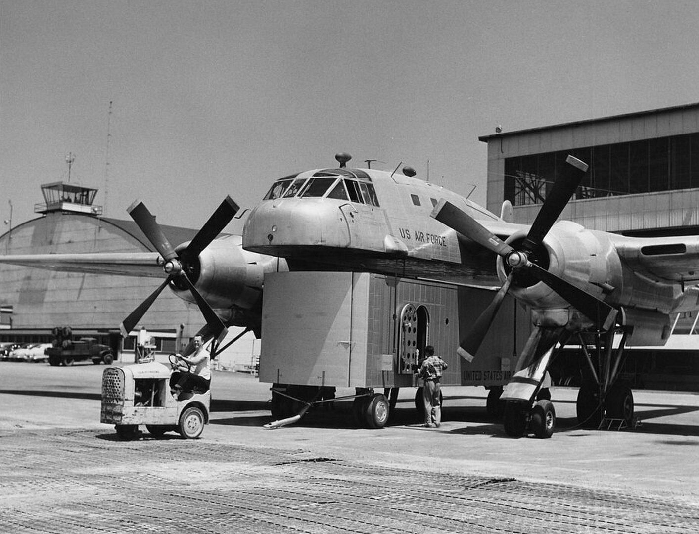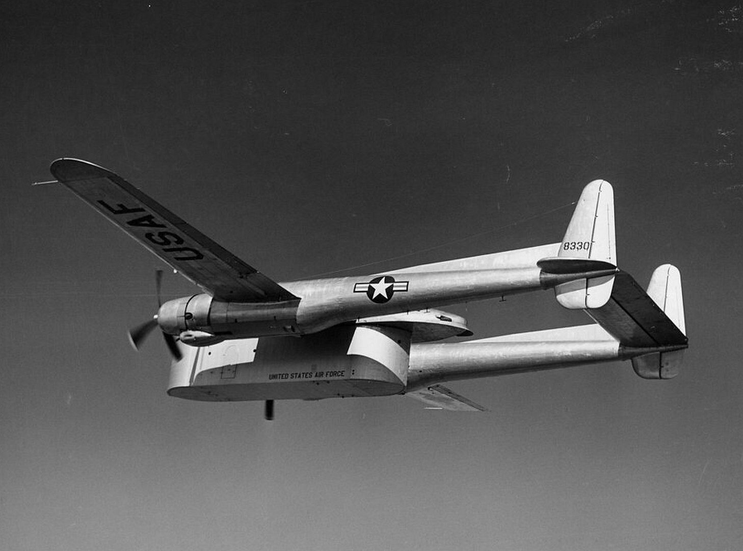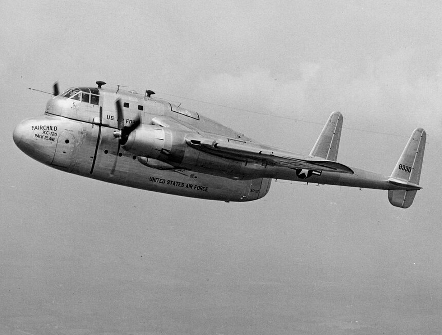 The prototype of the Fairchild XC-120 Packplane was constructed at Fairchild's manufacturing facility in Hagerstown, Maryland, beginning in 1949 as an adaptation of the existing C-119 Flying Boxcar to address U.S. Air Force needs for versatile logistics transport. The aircraft utilized the fuselage of a C-119B model (serial 48-330, constructor's number 10312), from which the forward lower section was removed just below the flight deck to create space for the detachable cargo pod. The wings, Pratt & Whitney R-4360 engines, and twin-boom tail assembly were retained from the C-119 design, while the tricycle landing gear was replaced with a quadricycle configuration featuring four main struts integrated into the booms for enhanced support and adjustability when handling pods of varying sizes. Construction emphasized the integration of specialized attachment mechanisms for the pod, including electric winches for hoisting and inflatable gaskets for airtight sealing, alongside reinforcements to the elevated flight deck to compensate for the missing lower fuselage structure.These modifications presented significant engineering challenges, particularly in balancing structural integrity with aerodynamic stability in the absence of the pod, requiring extensive ground testing and iterative adjustments during assembly. The single prototype was completed by mid-1950, marking the culmination of the manufacturing process without a second example being built due to the experimental nature of the program.